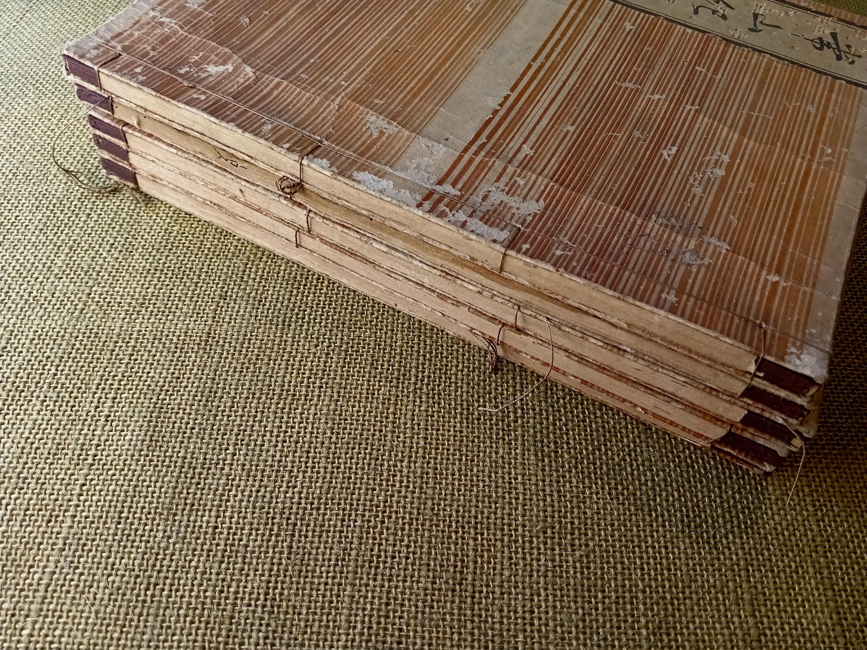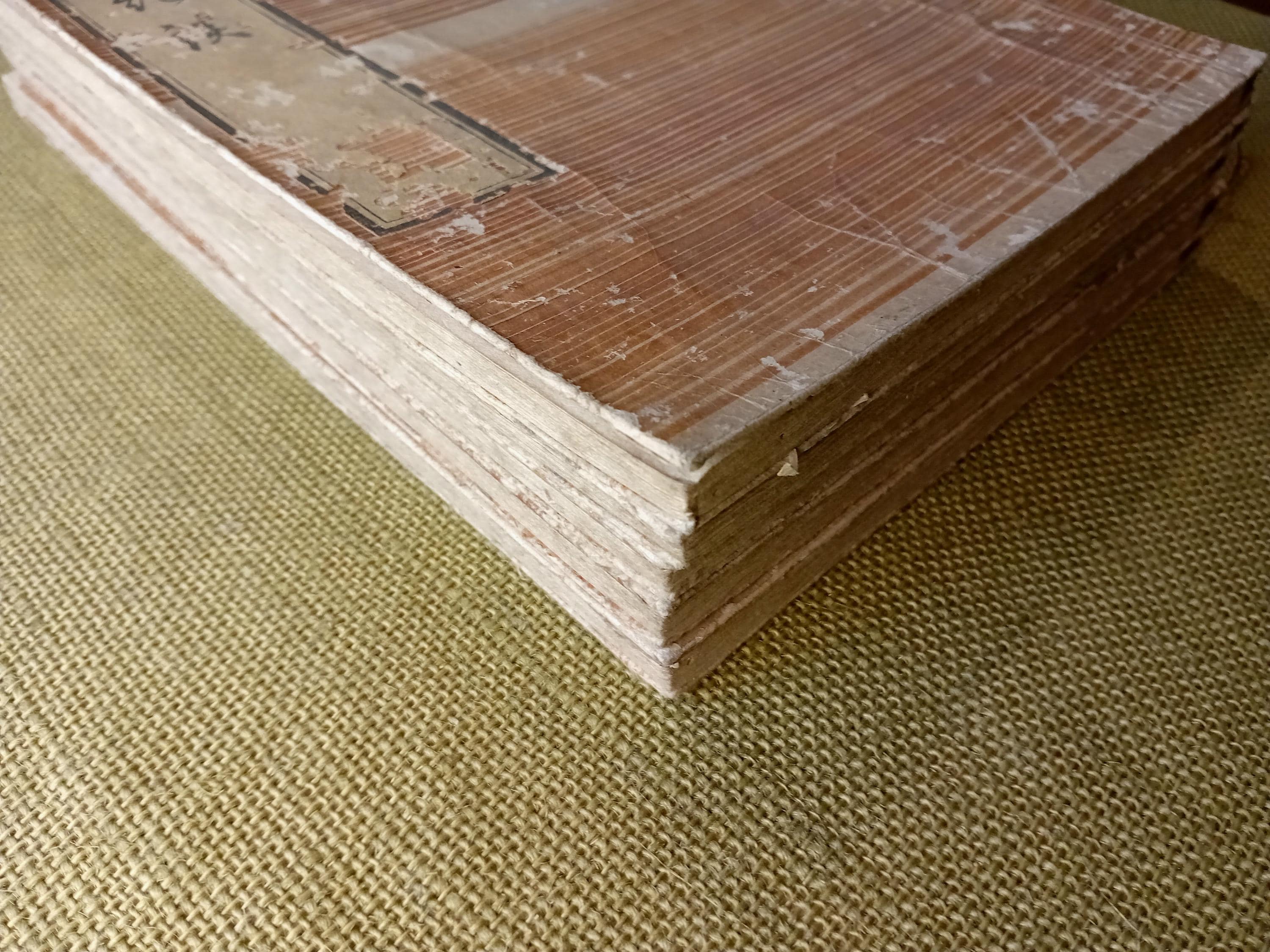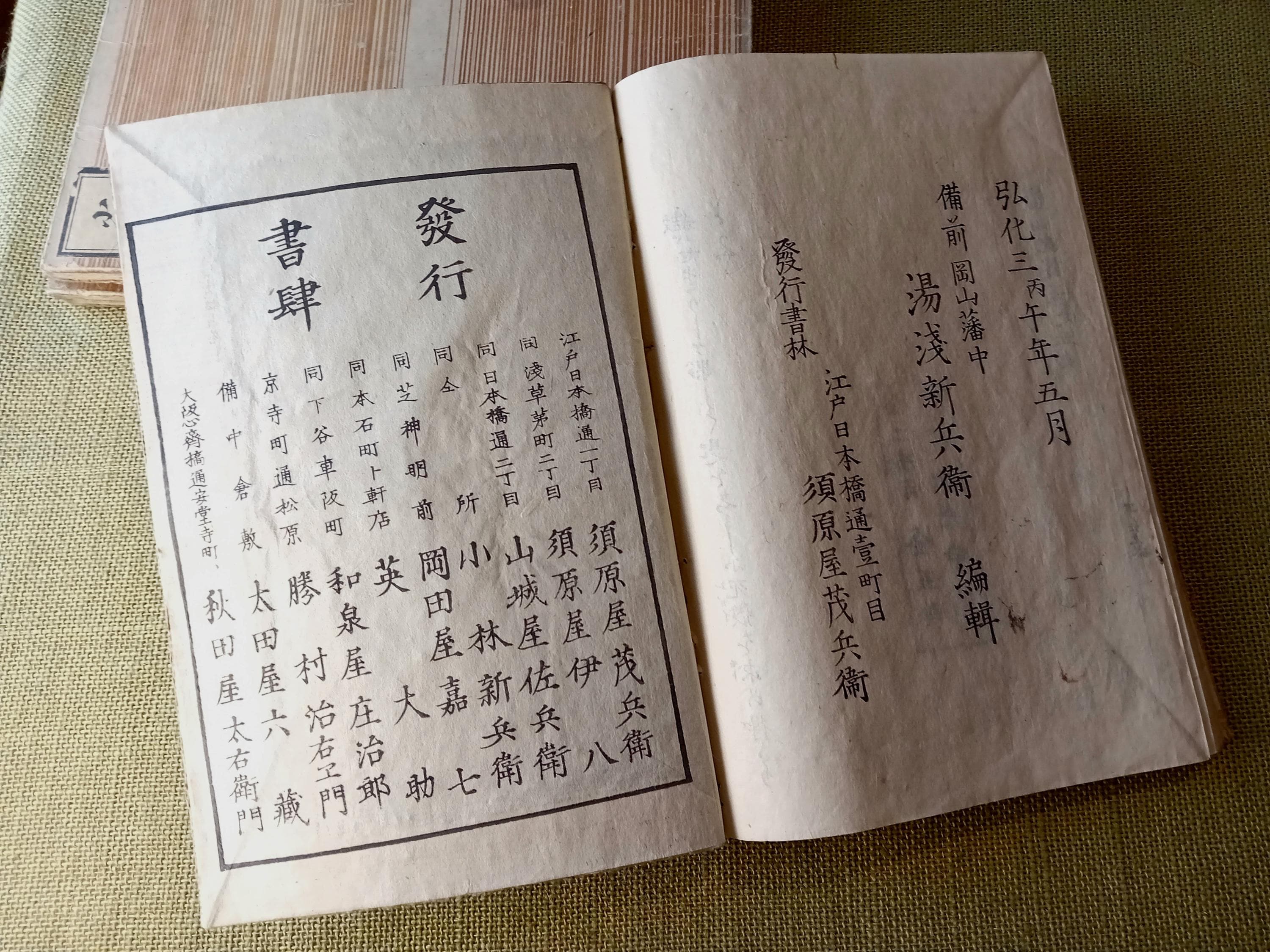 This set is especially attractive because the dating and publishing line are clearly established in the books themselves. The fifth volume retains the colophon dated to the fifth month of 1846, naming Yuasa Shinbei as compiler and Suharaya Mohei of Edo as publisher. That gives the set a firm bibliographic anchor and makes it more than a decorative survival - it is a securely attributable Edo woodblock edition.