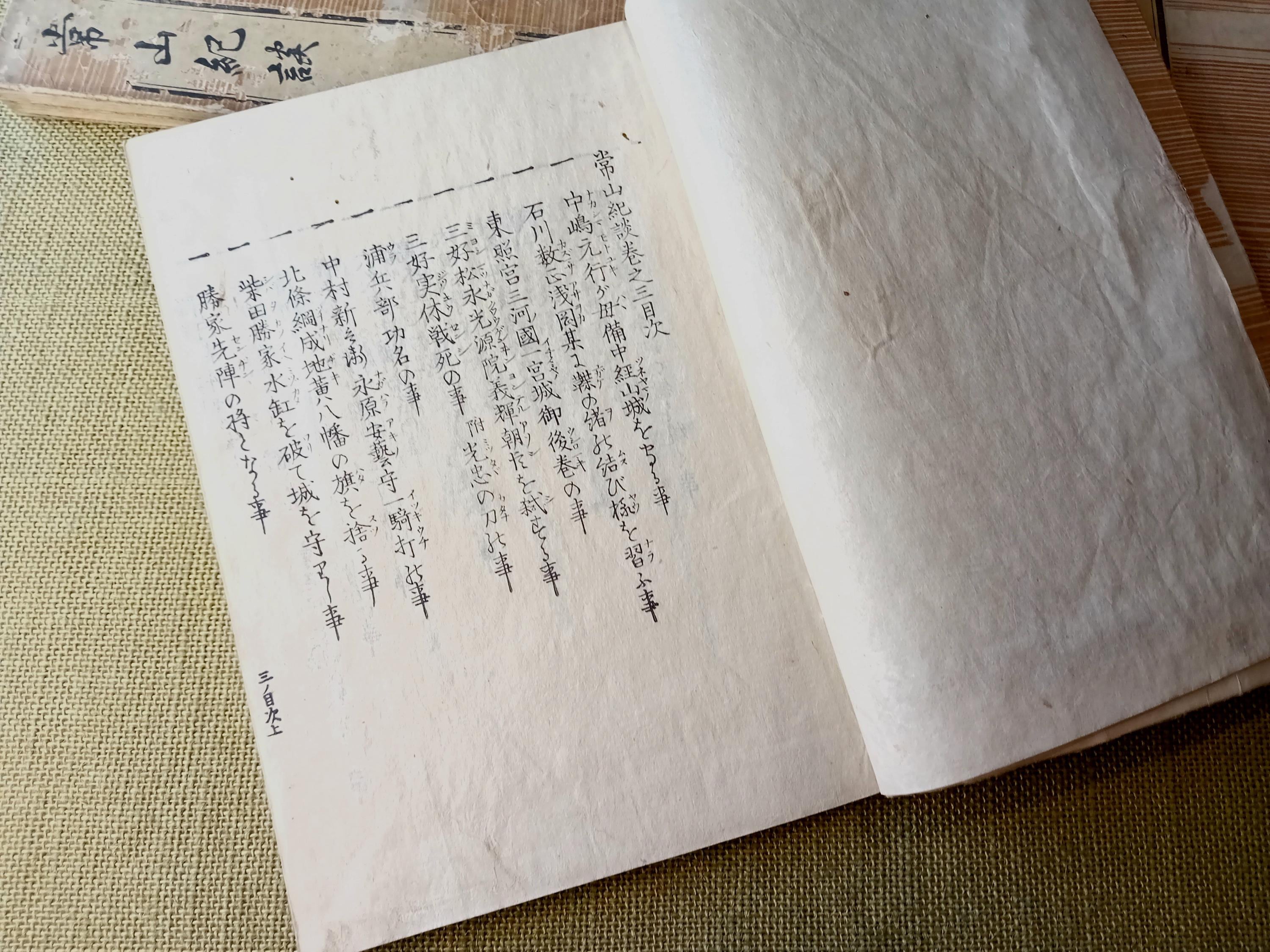The appeal of the work lies in this dense anecdotal structure. The books bring together stories of samurai resolve, judgment under pressure, loyalty, reputation, military intelligence, sudden reversals, severe decisions, and the moral atmosphere surrounding men of rank and service. For a modern reader or collector, the set is valuable not only as an Edo-period printed object, but also as a compact entry into the narrative world of warrior memory and historical storytelling.