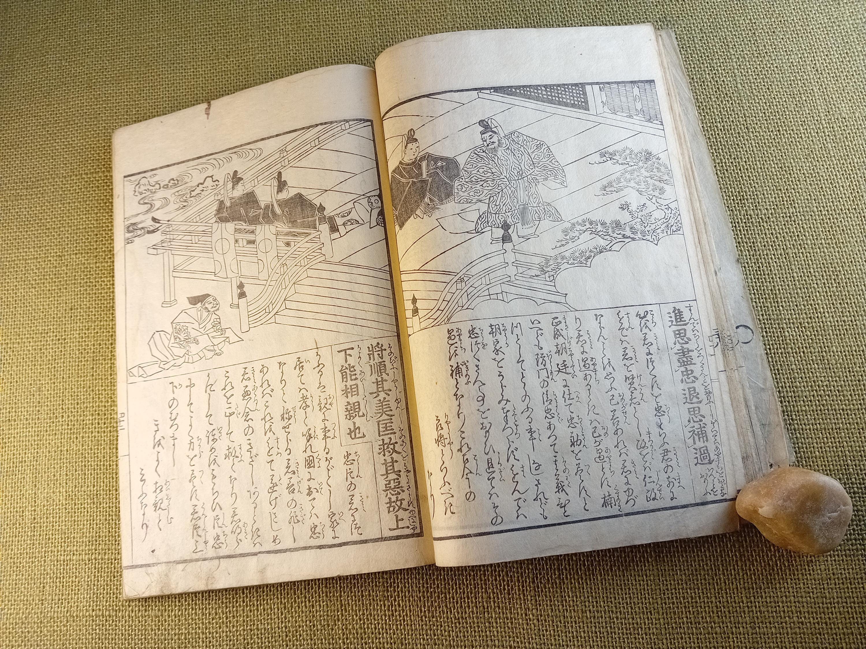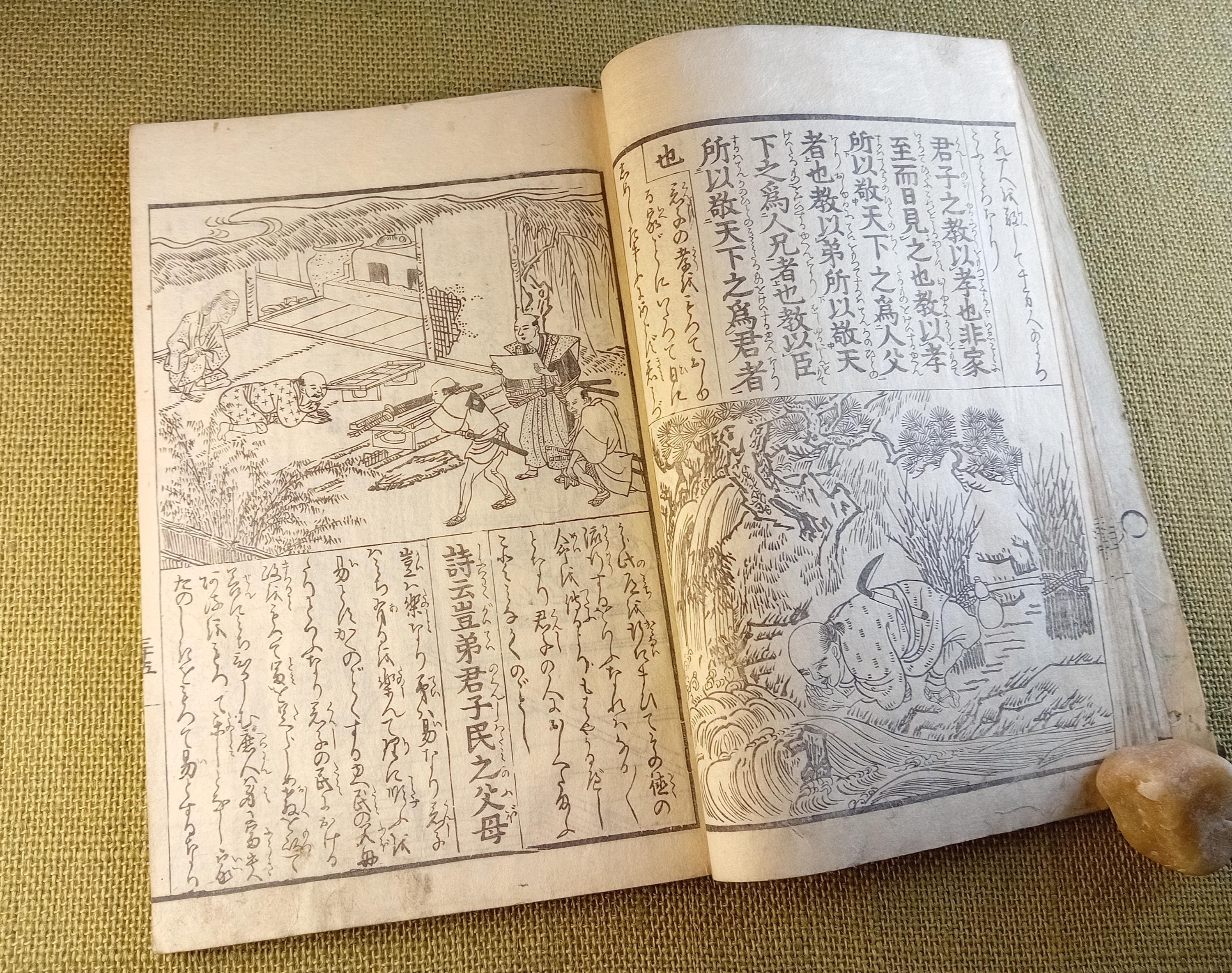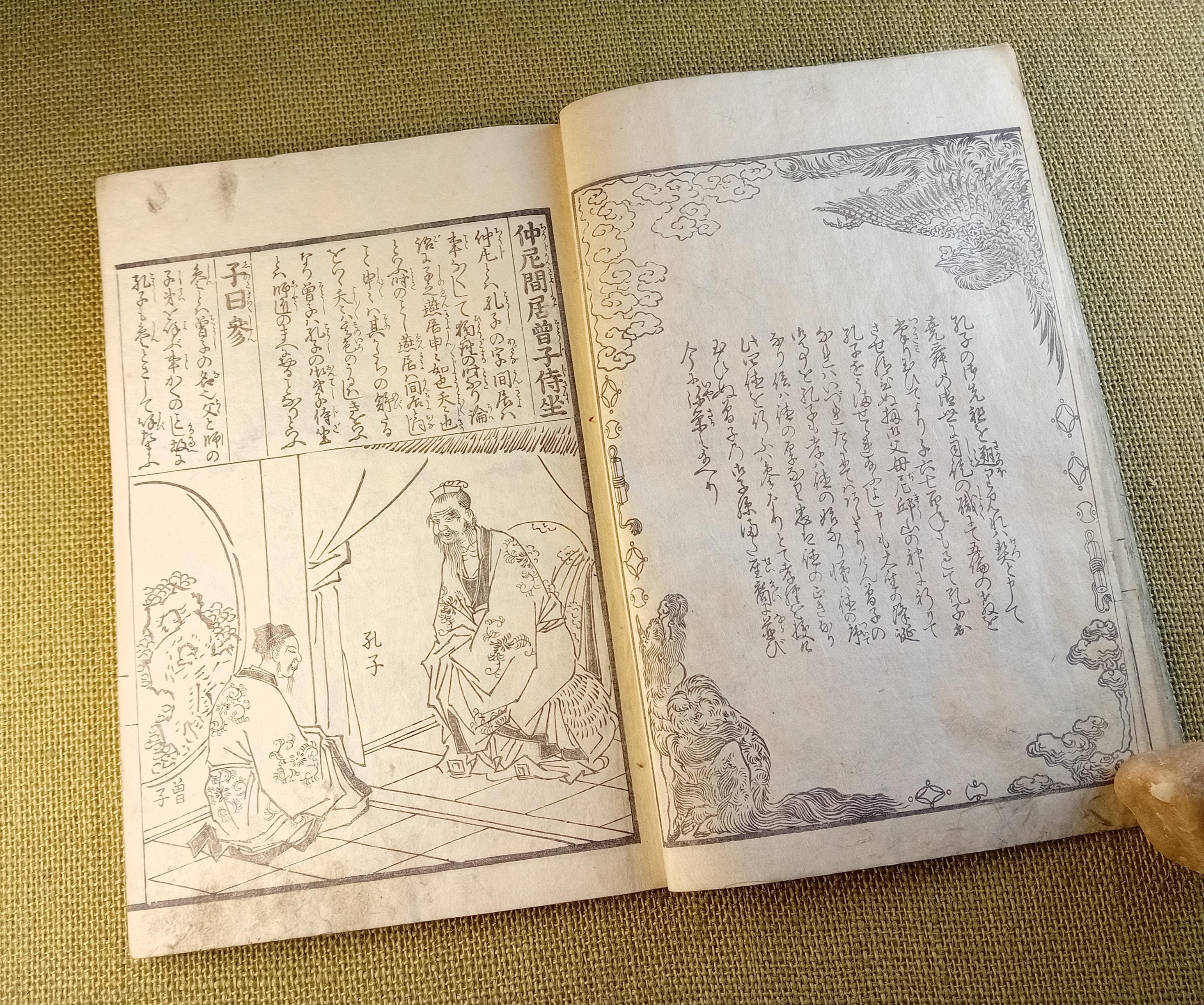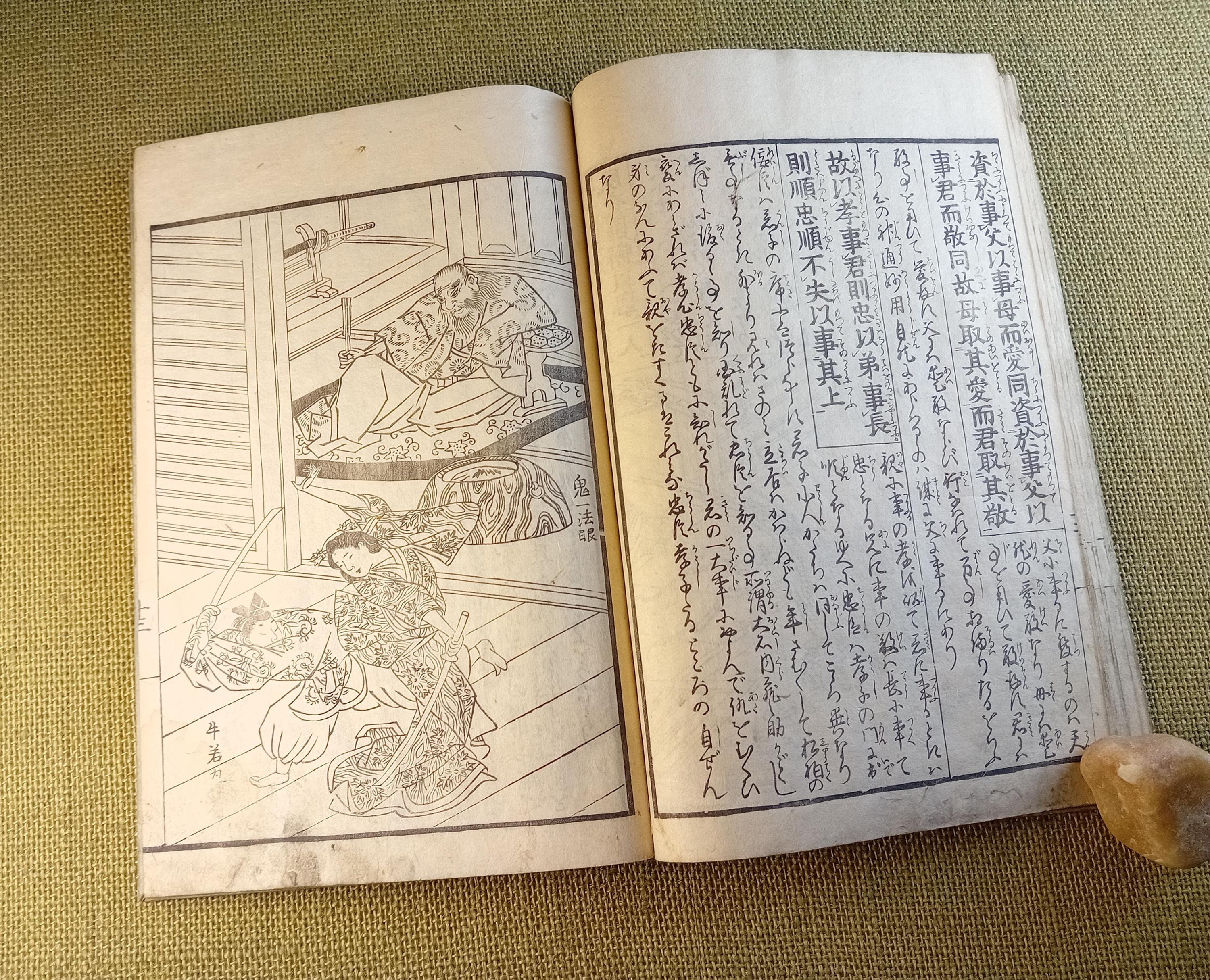 This is an illustrated edition of the Confucian classic Kokyo, devoted to filial piety, family duty, and moral conduct. It belongs to the didactic and educational book culture of late Edo. Fukuoka University describes it as a Japanese explanatory edition of the classic text with reading aids and commentary, while Tokyo Gakugei University classifies this edition within the educational tradition.