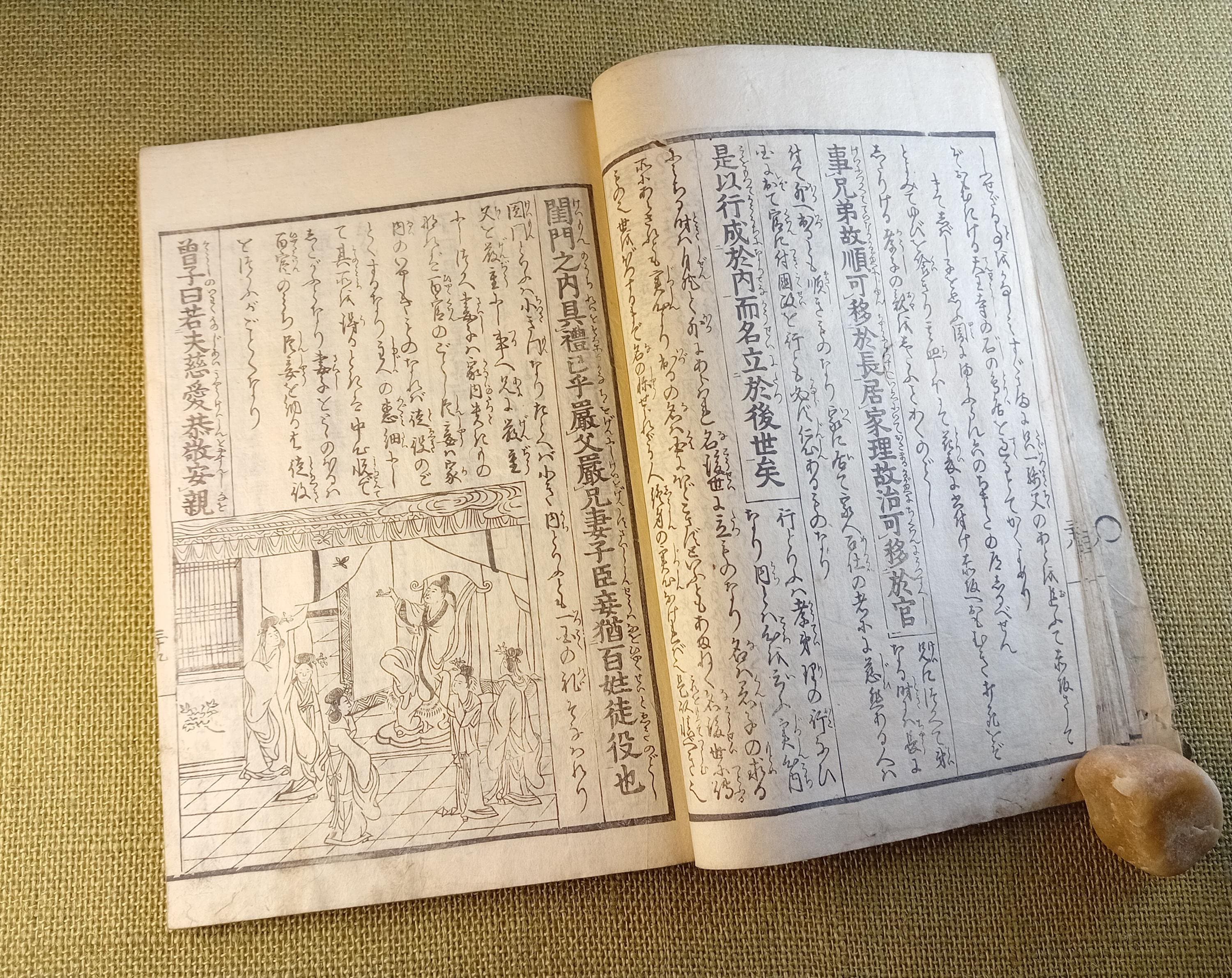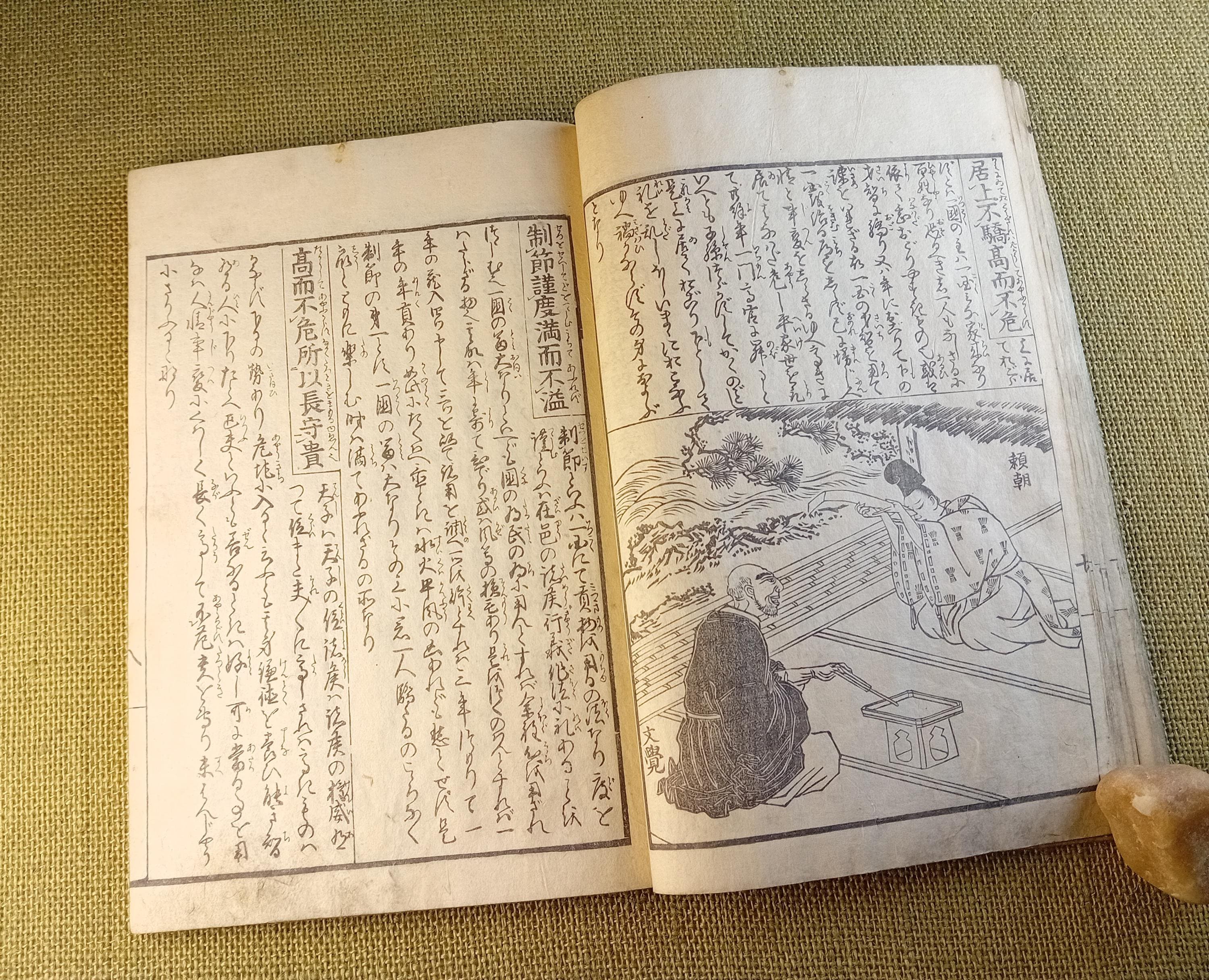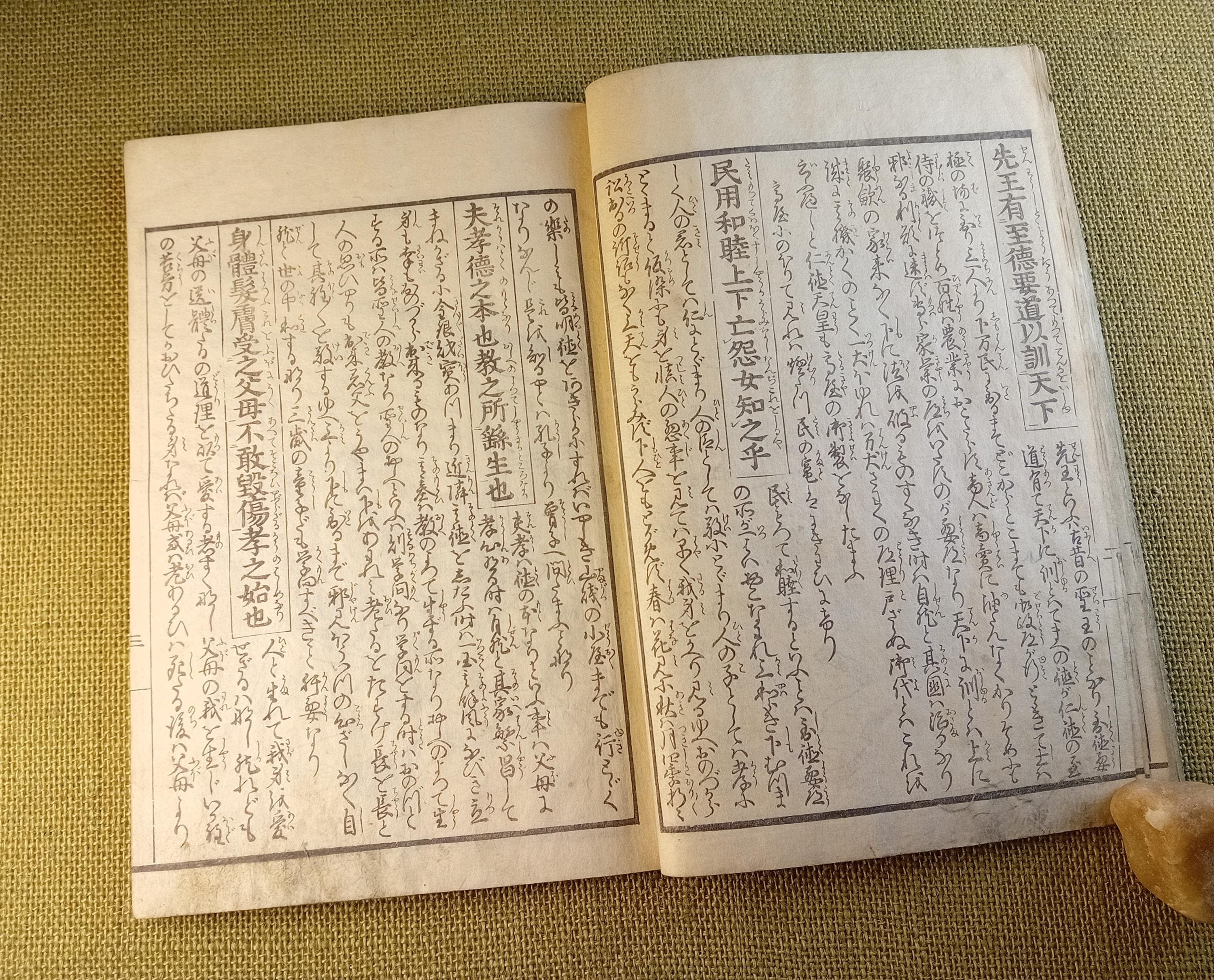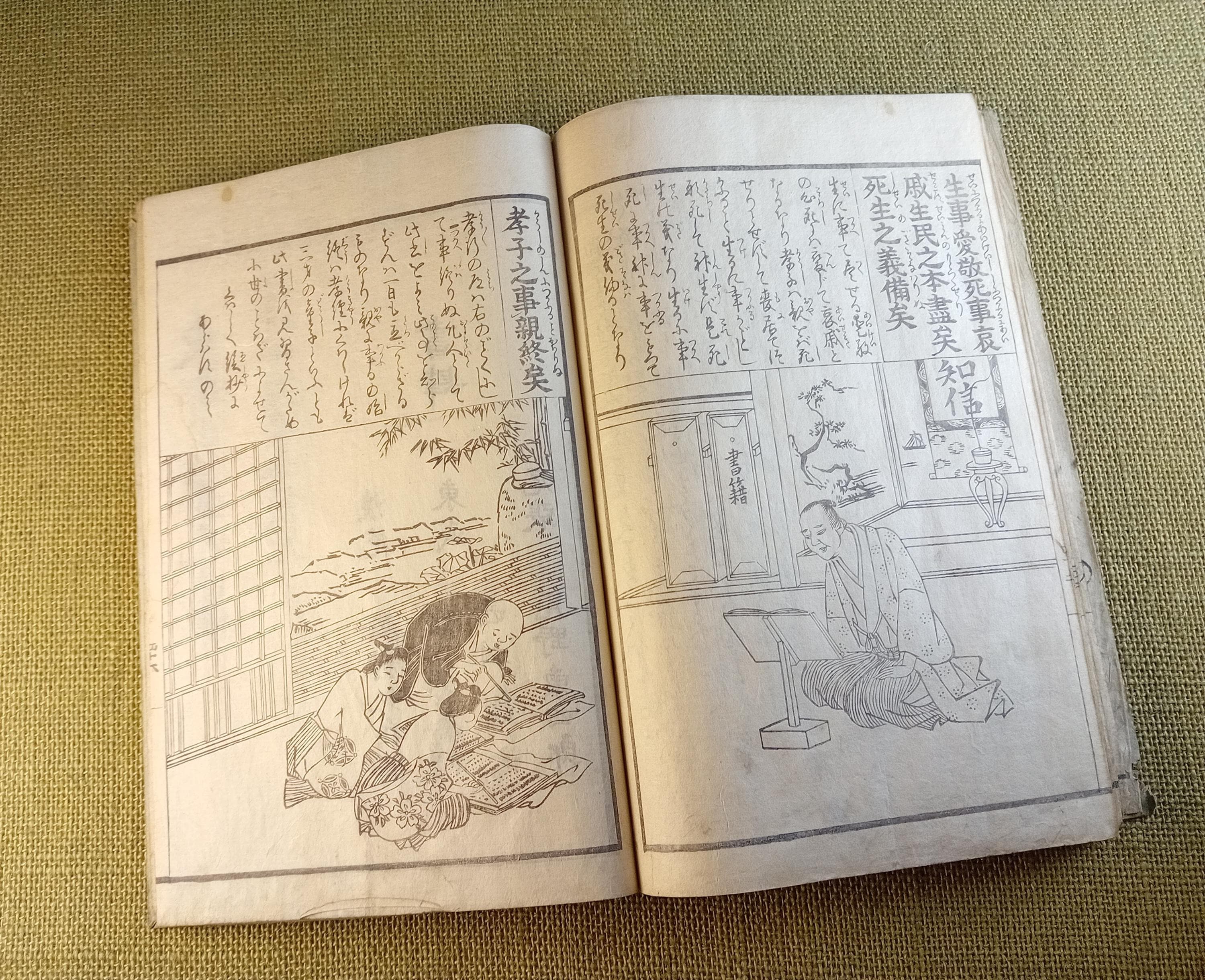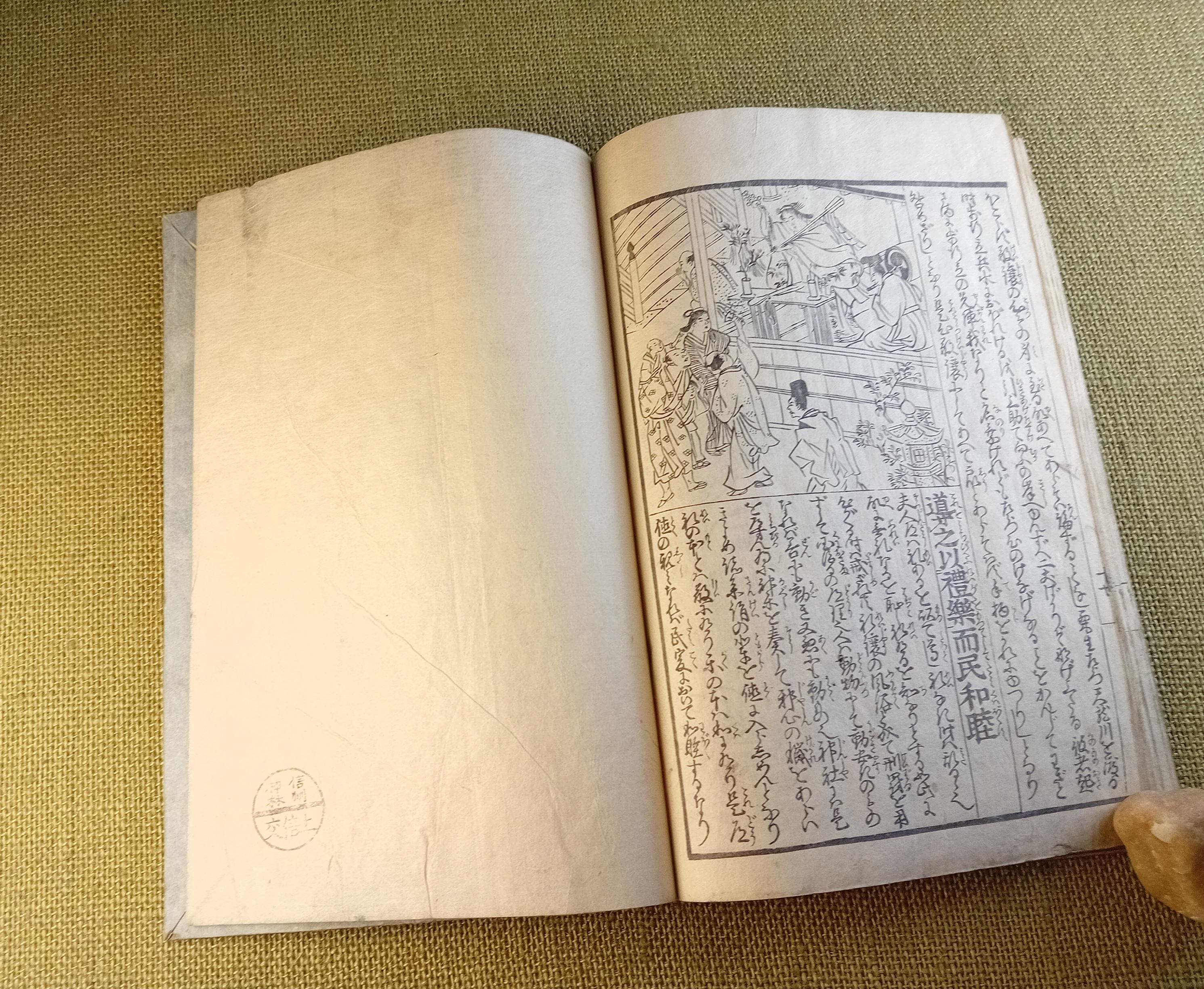 This is an illustrated edition of the Confucian classic Kokyo, devoted to filial piety, family duty, and moral conduct. It belongs to the didactic and educational book culture of late Edo. Fukuoka University describes it as a Japanese explanatory edition of the classic text with reading aids and commentary, while Tokyo Gakugei University classifies this edition within the educational tradition.