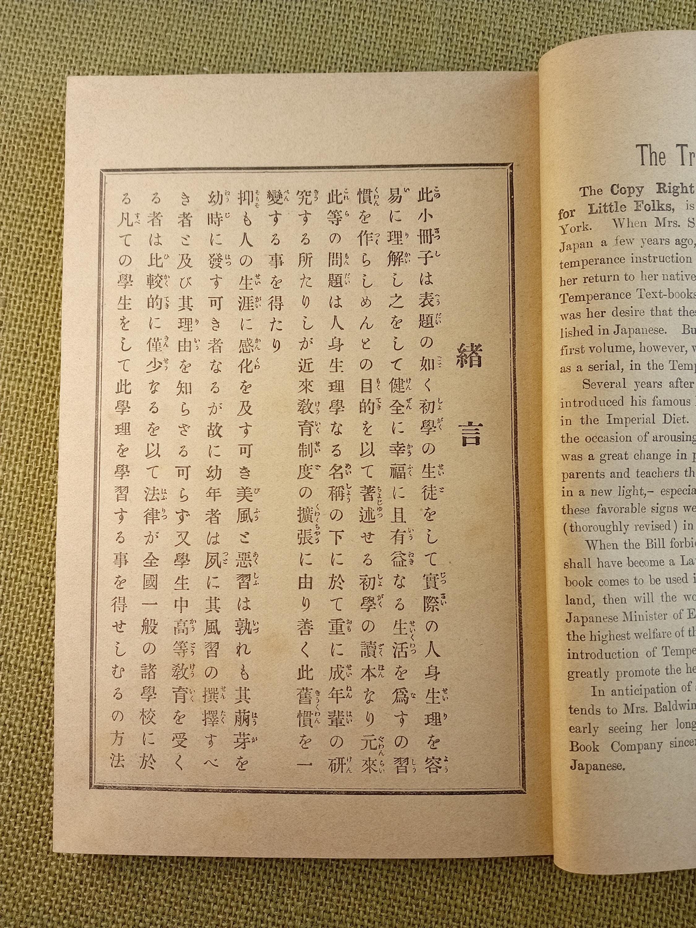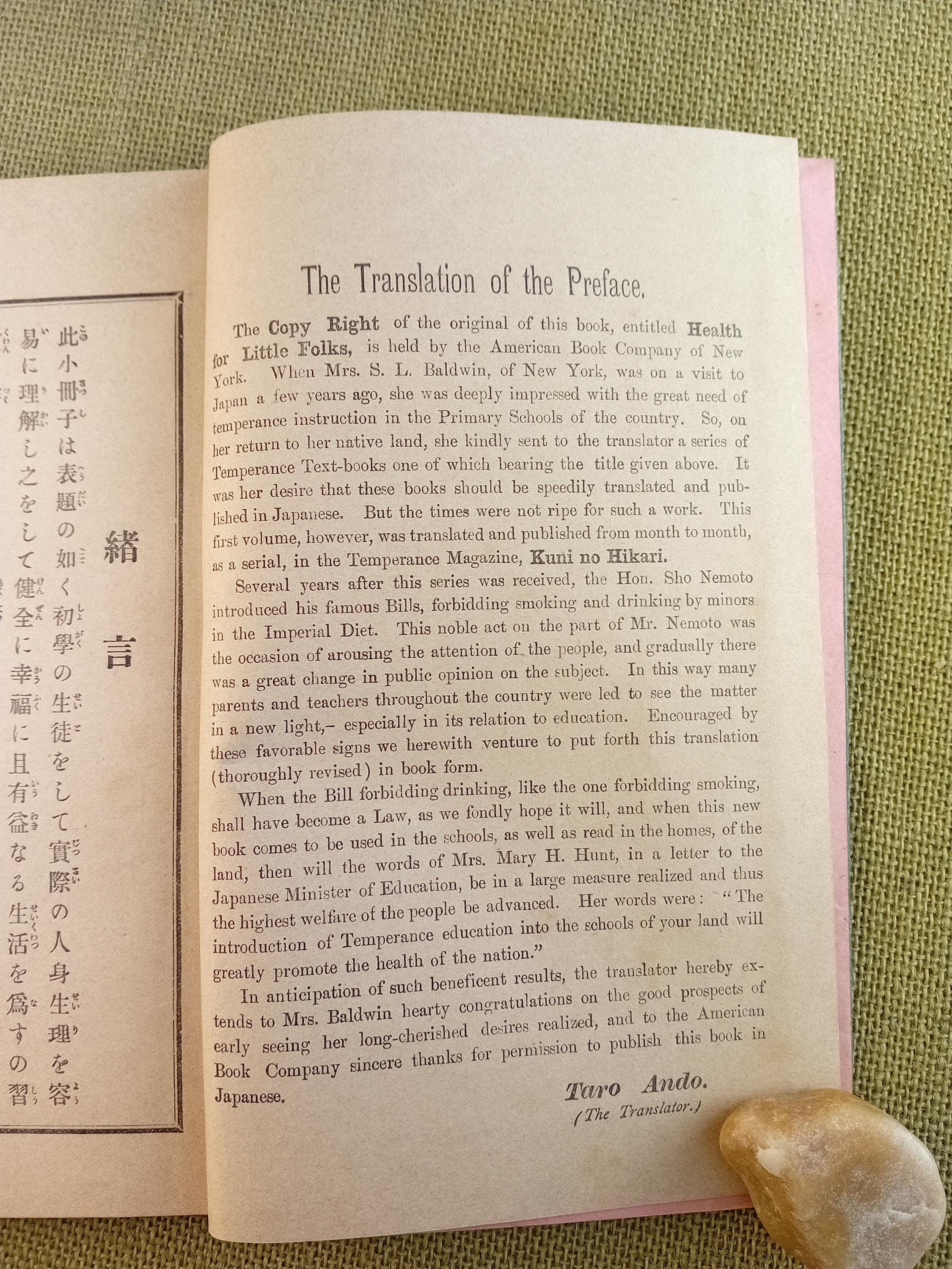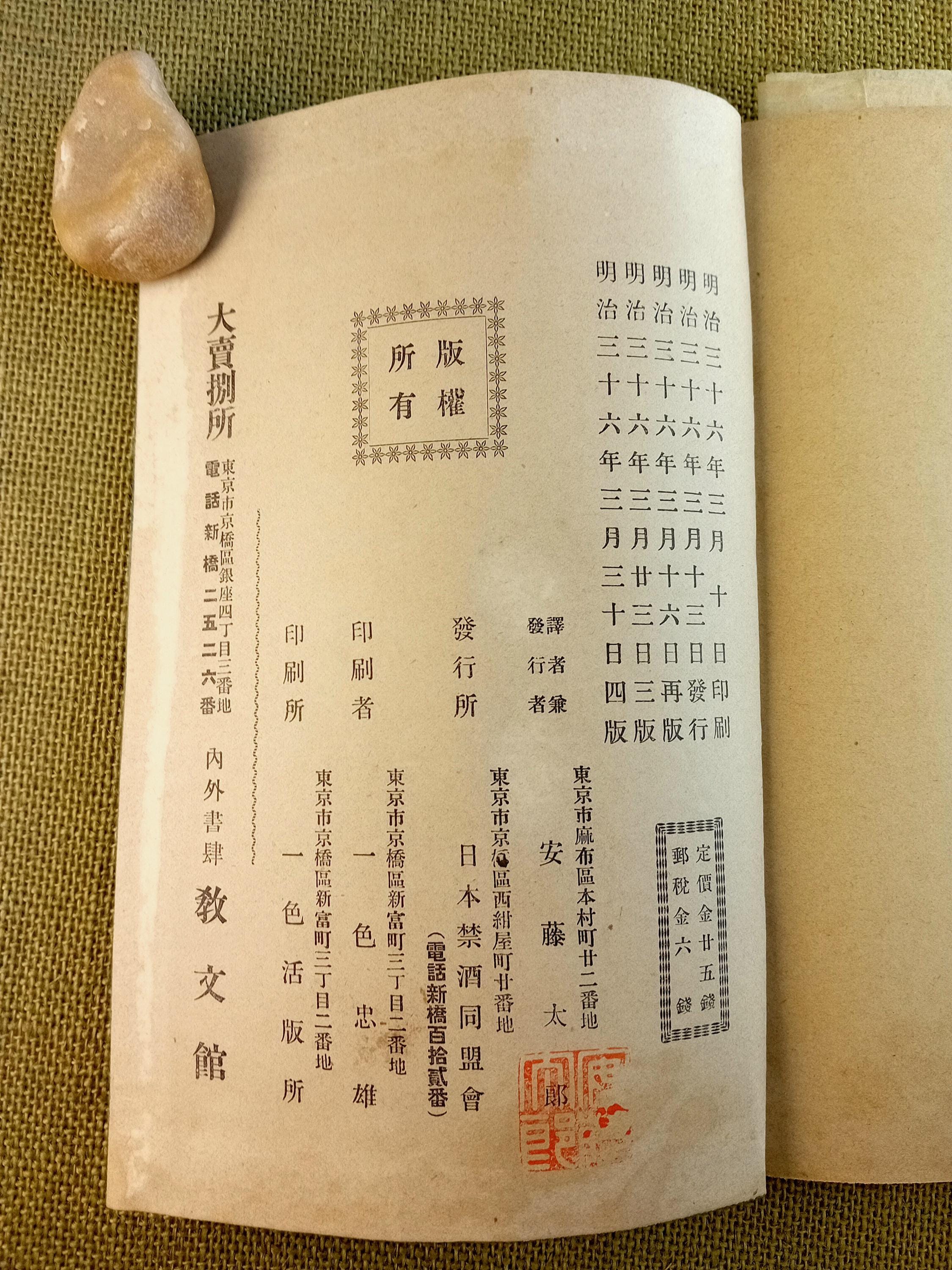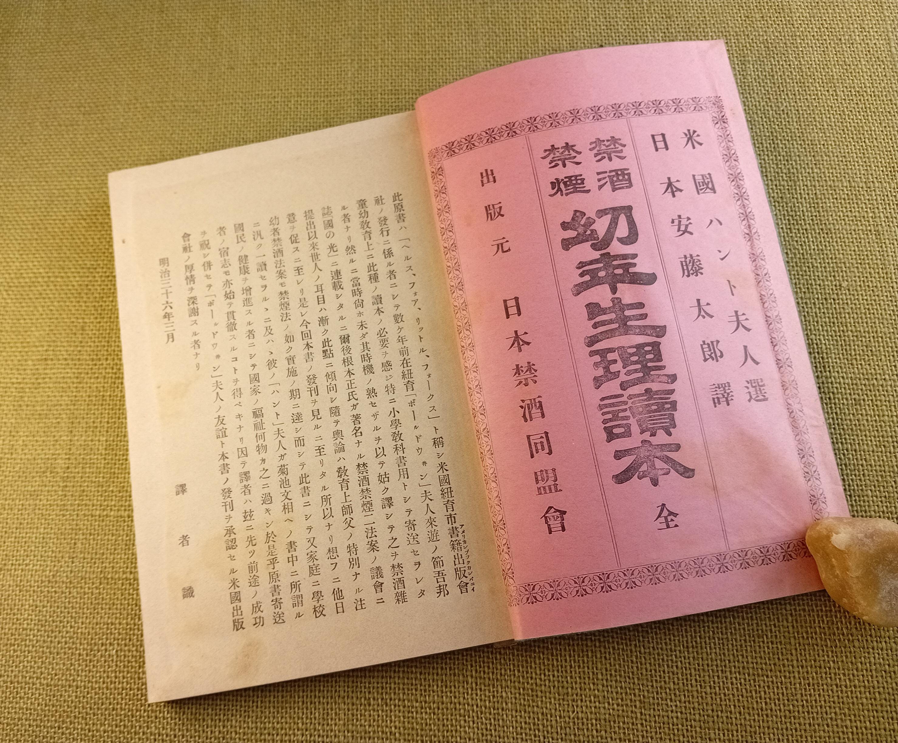 The book belongs to the pedagogical and social print culture of late Meiji Japan. It brings together school culture, hygienic education, and the theme of social reform. For a present-day collector, it is an authentic document of Japanese educational history, the temperance movement, and translated book culture of the early 20th century.