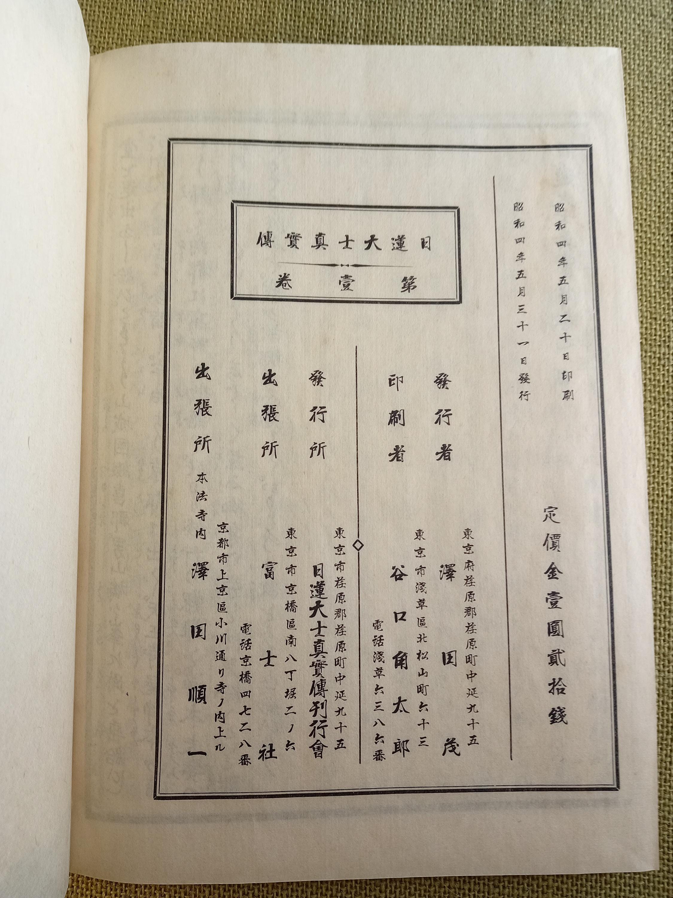 The title Nichiren daishi shinjitsuden appears on both the cover and the colophon. The colophon gives the printing and publication dates in May 1929. The listed price is 1 yen 20 sen.