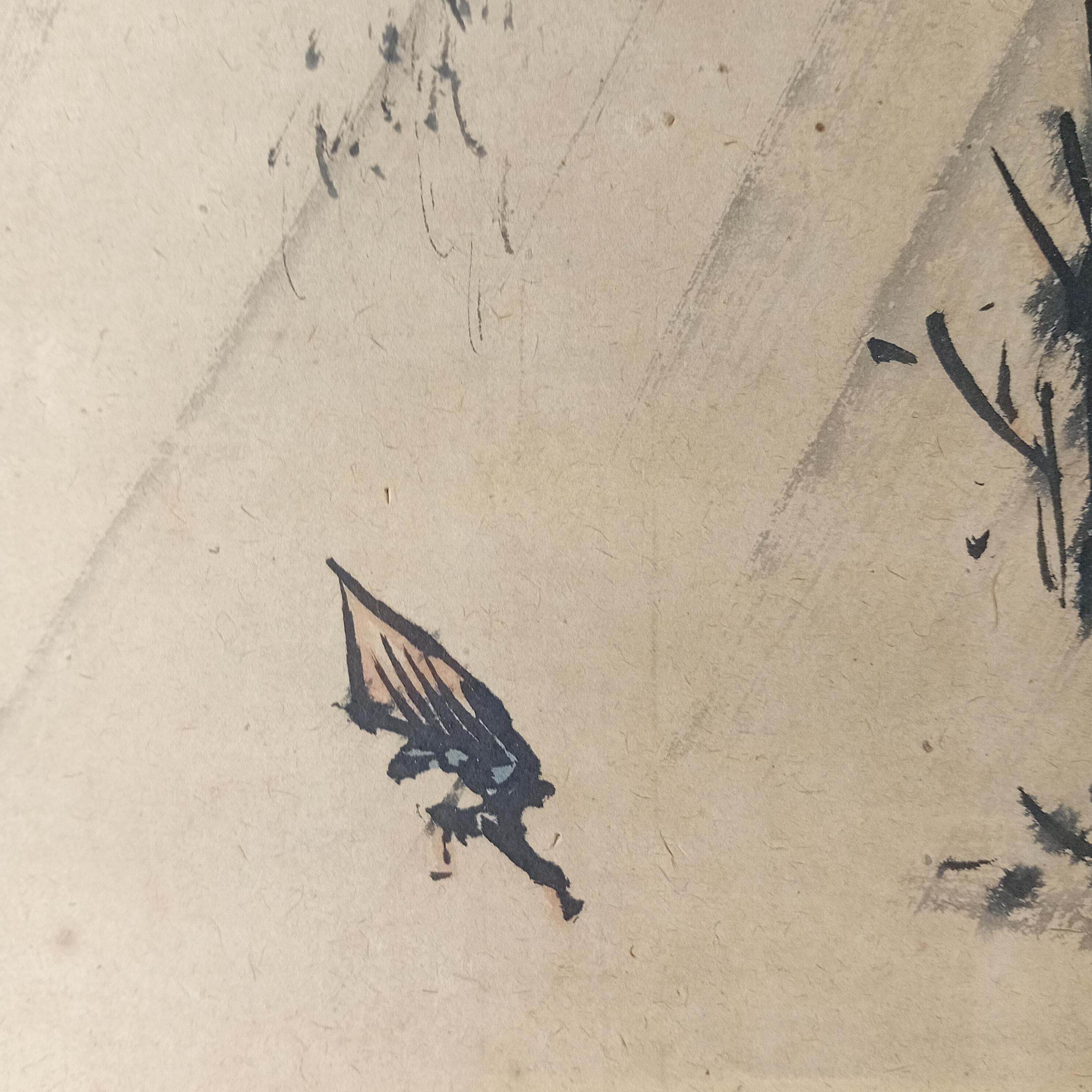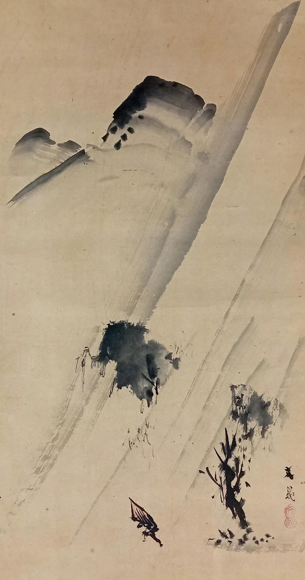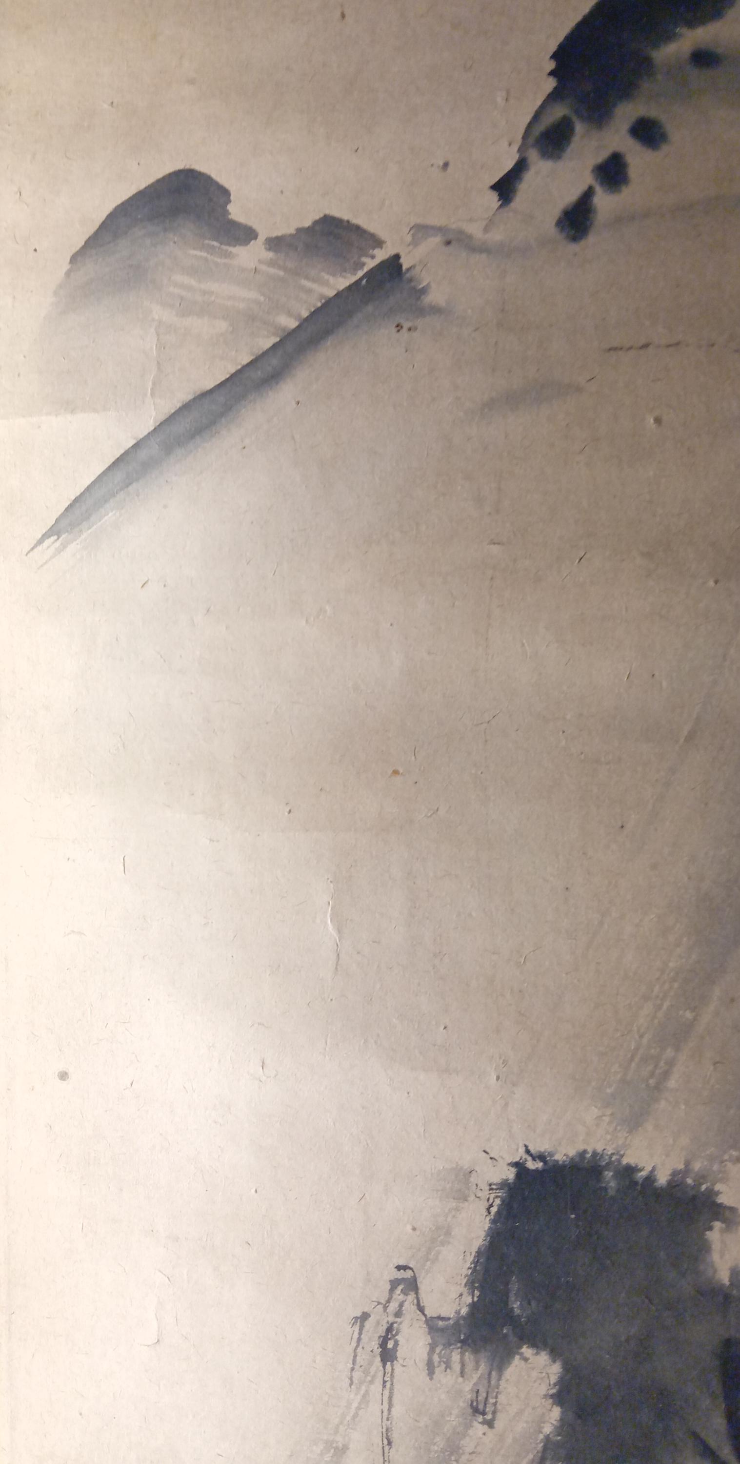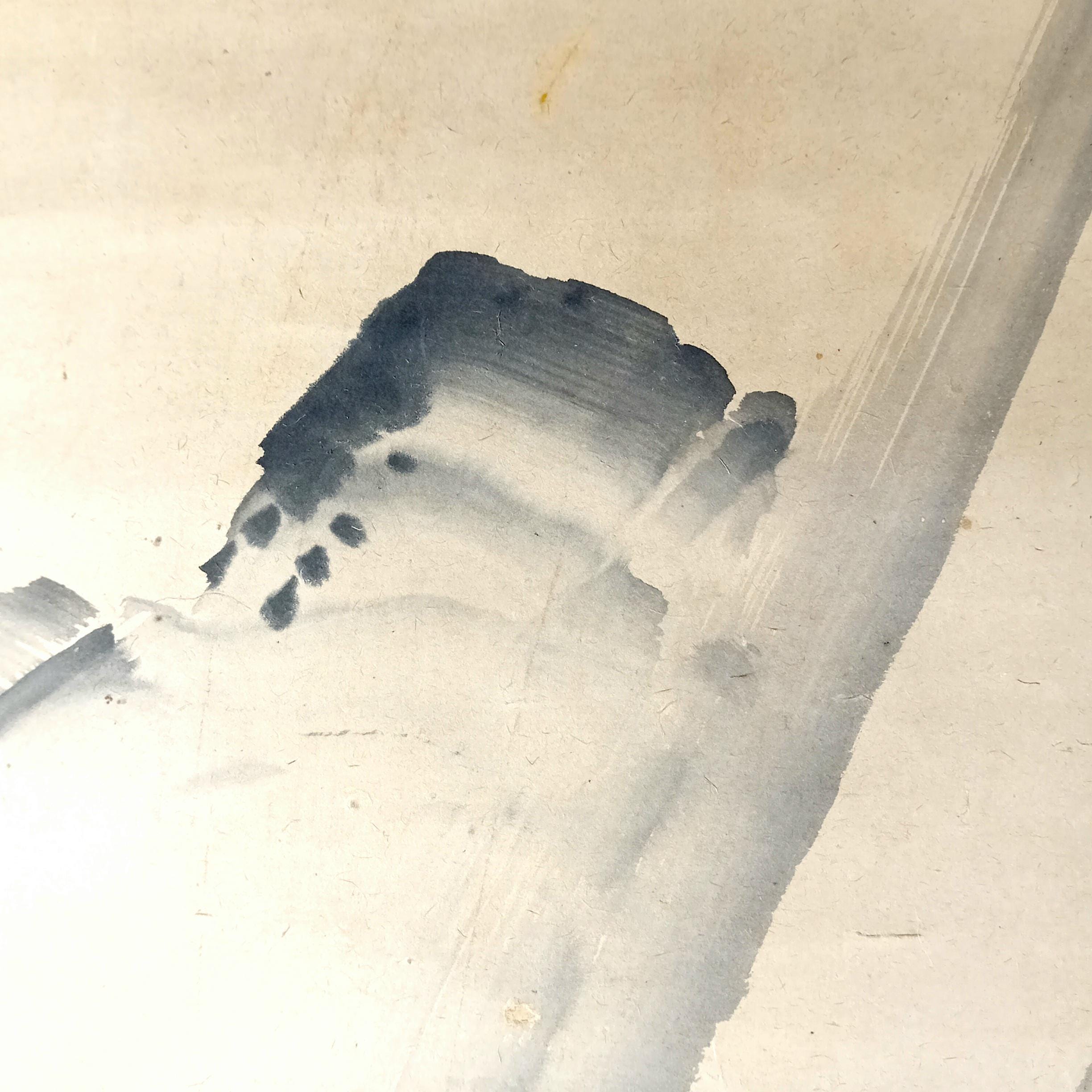Executed in sumi ink, this is a restrained landscape composition with free brushwork, open space, and soft tonal transitions.