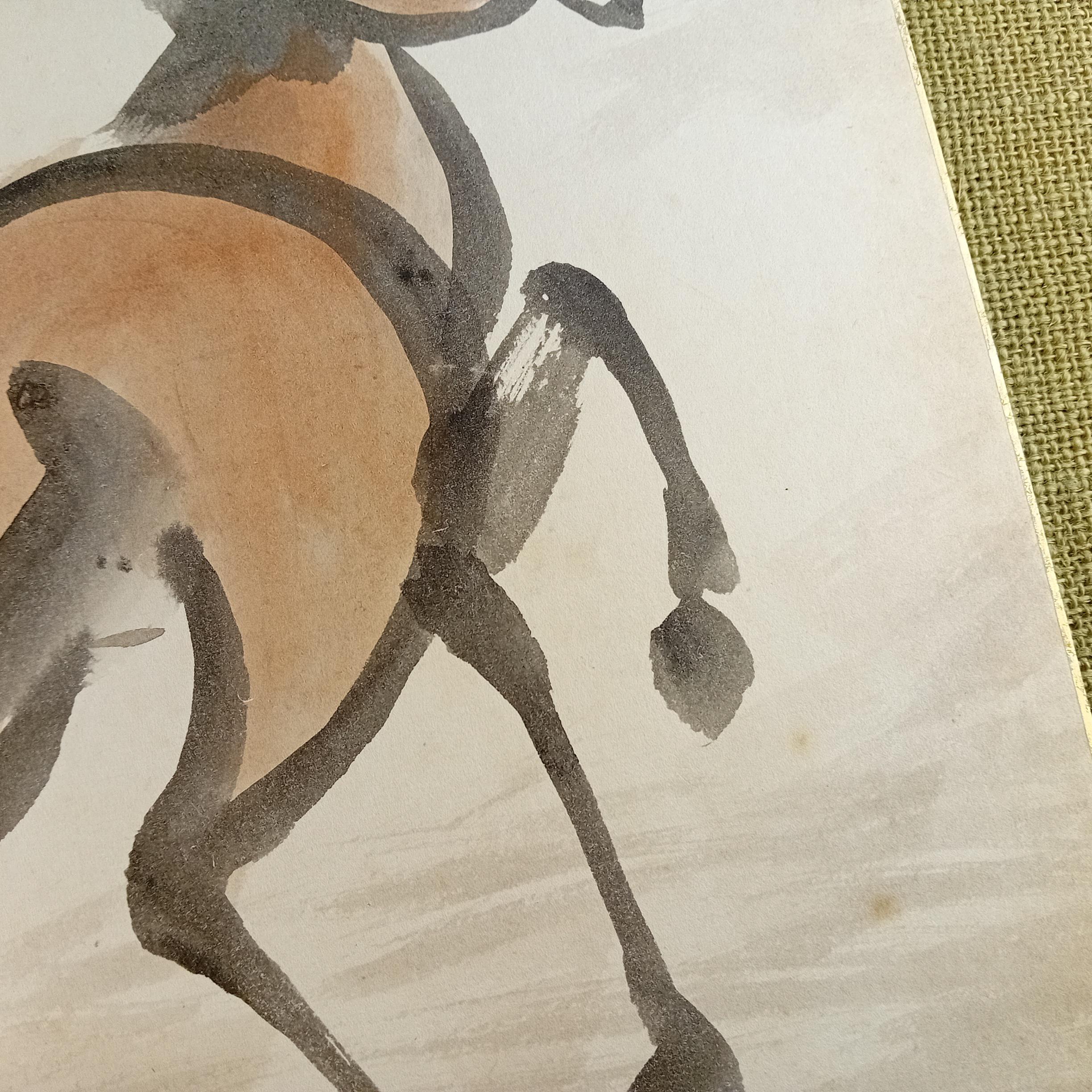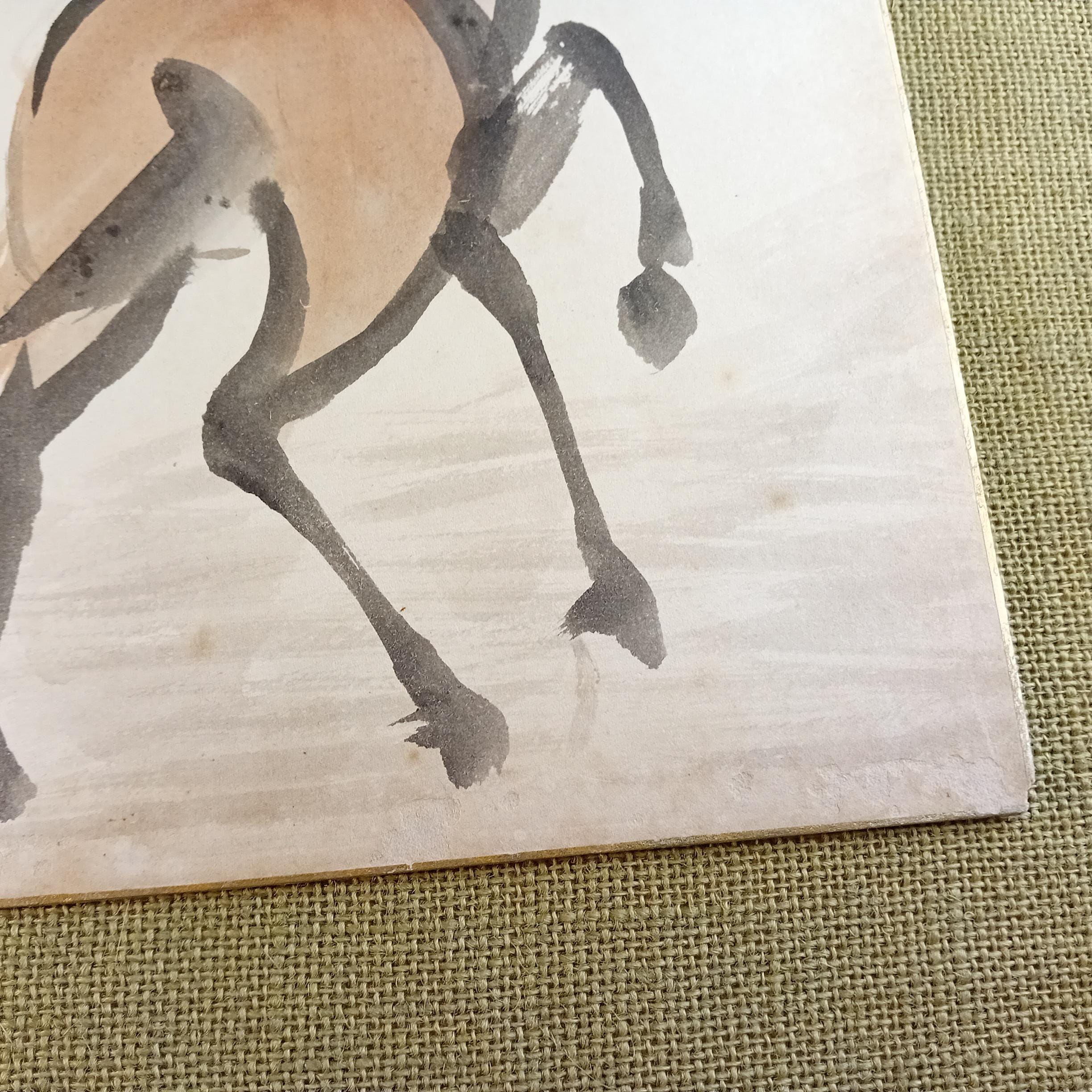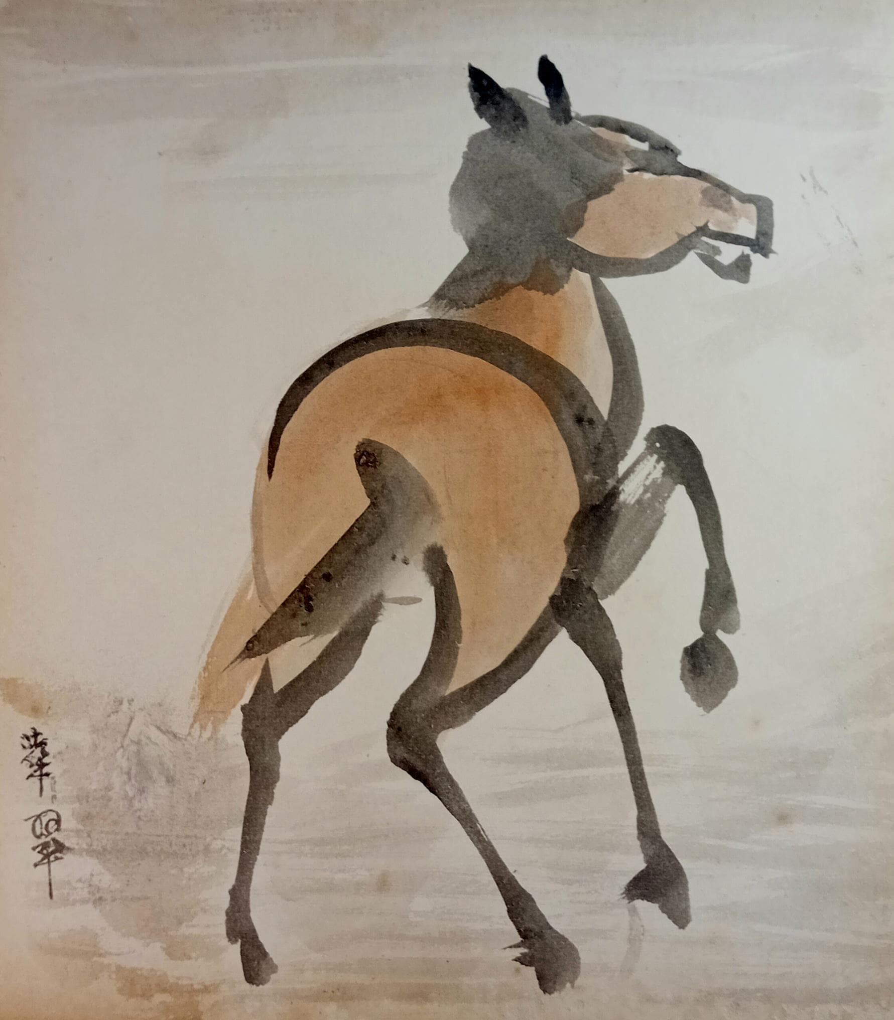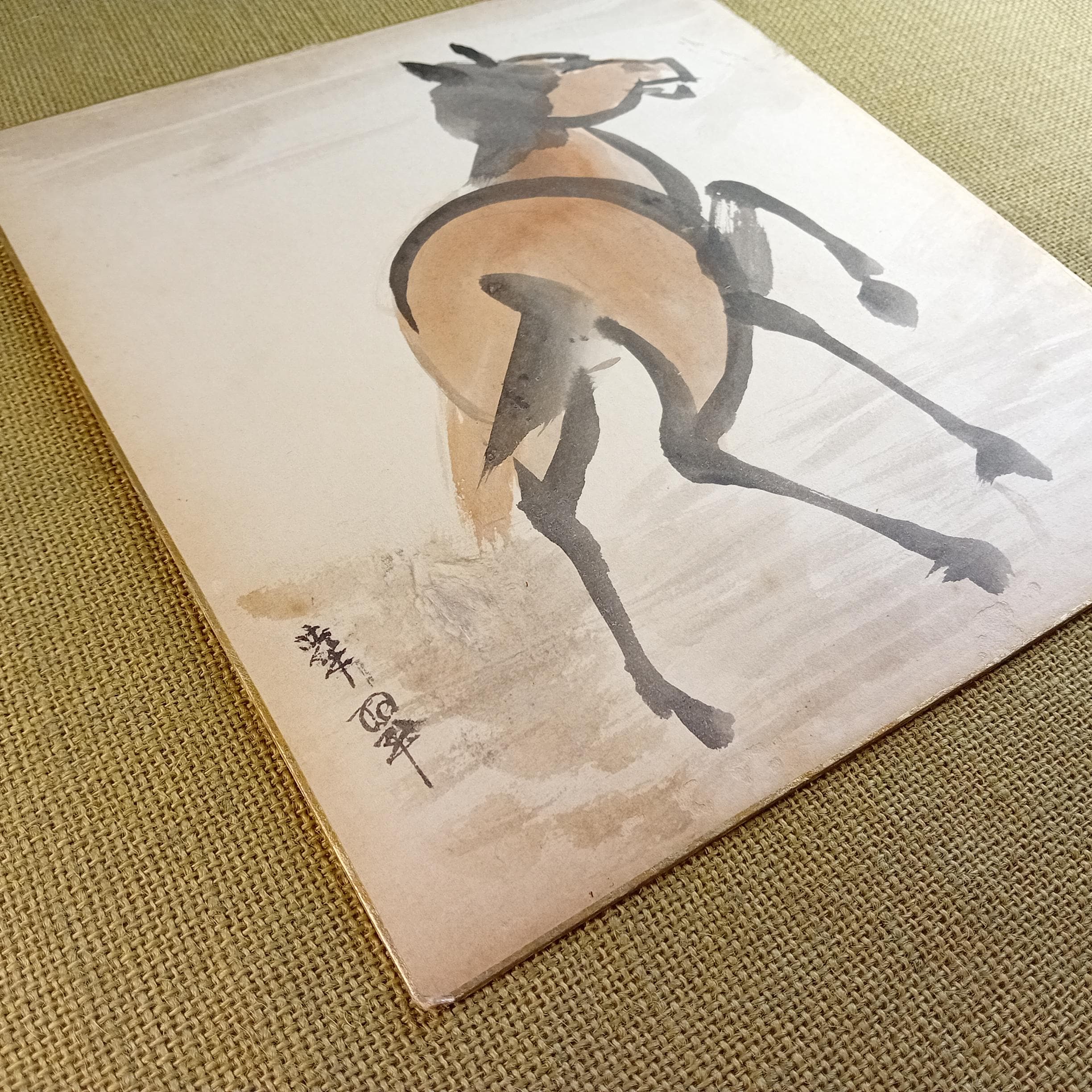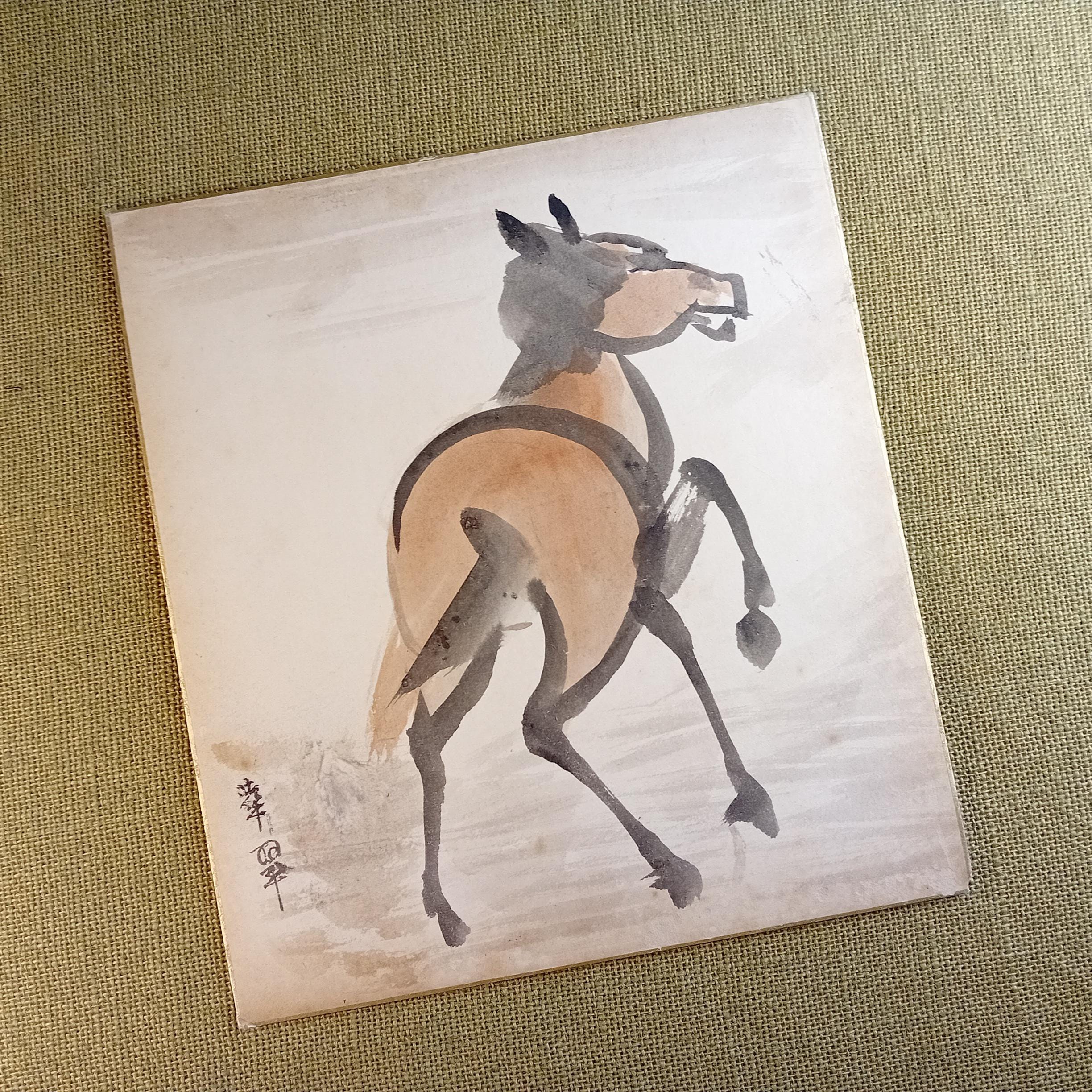 Japanese shikishi from the mid Showa period with a horse image. The work is executed in sumi ink and light color, in a free decorative manner linked to the tradition of Japanese ink painting and calligraphic brush drawing.