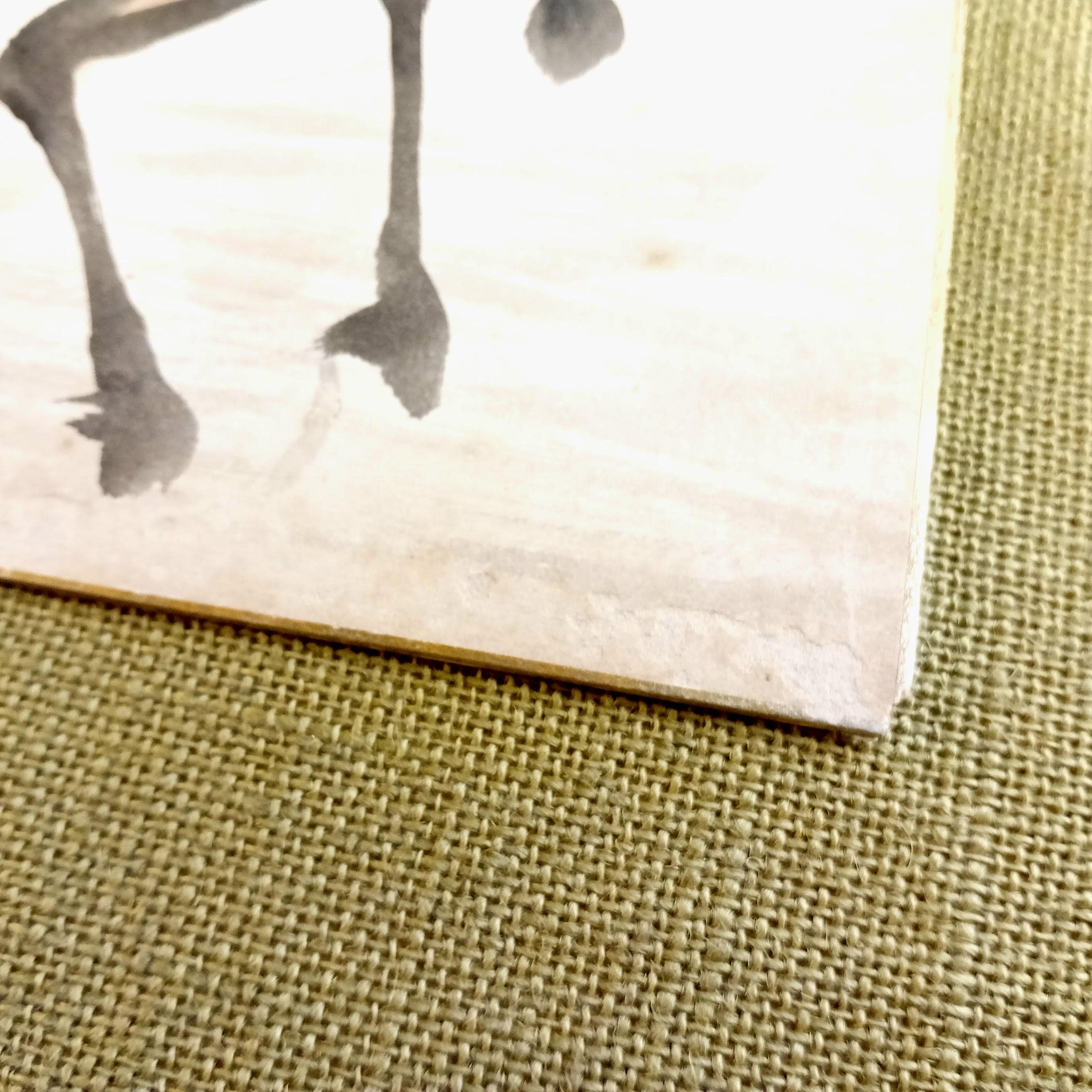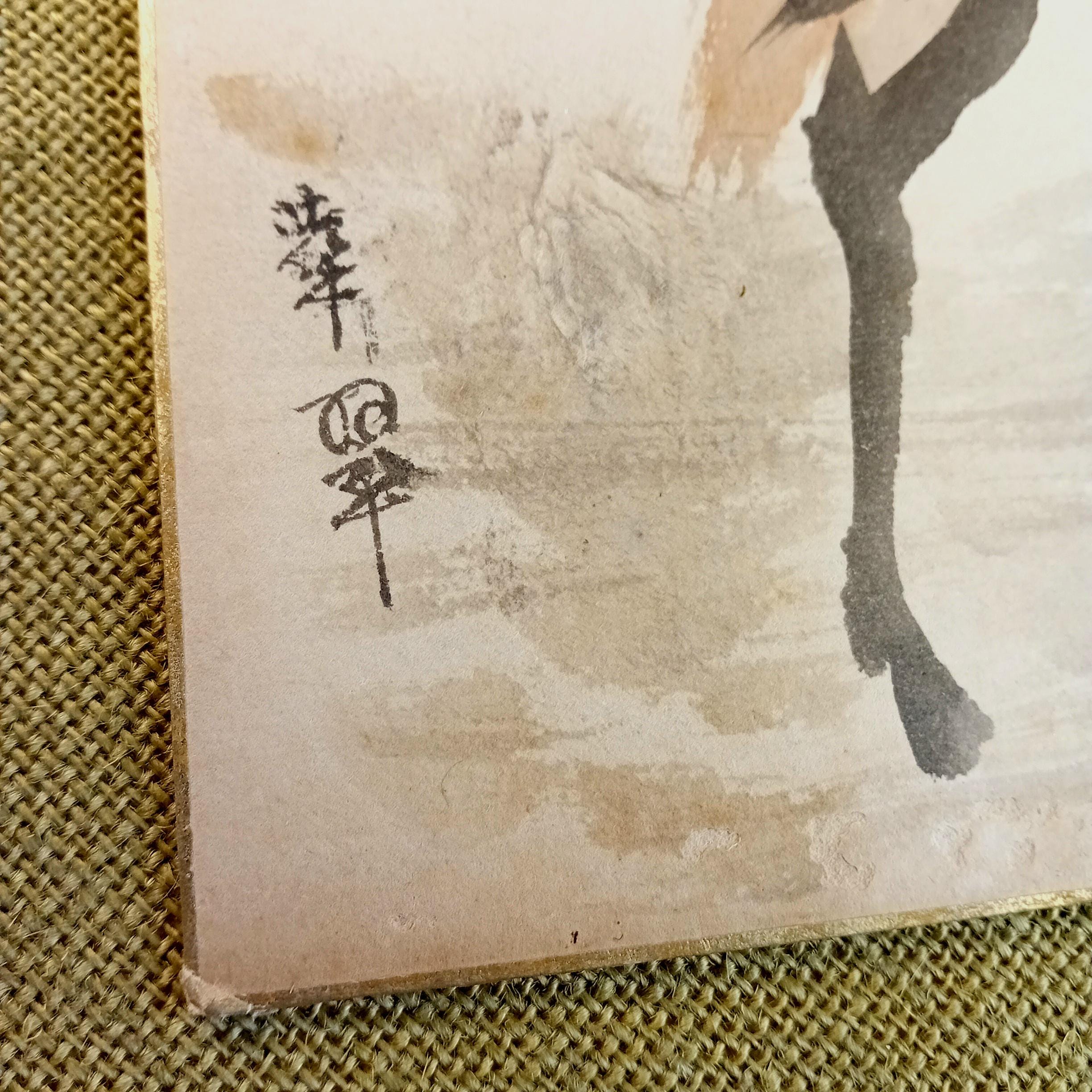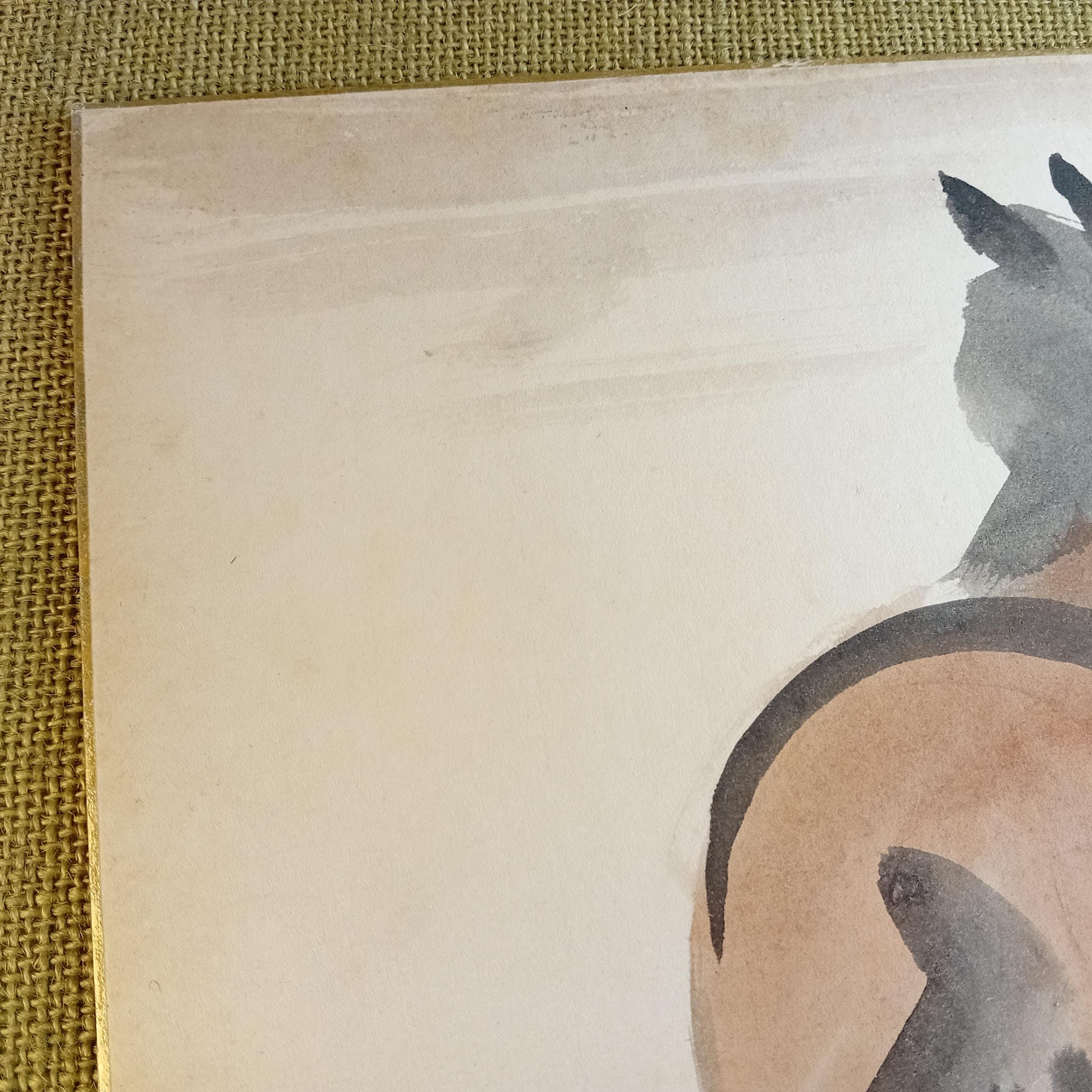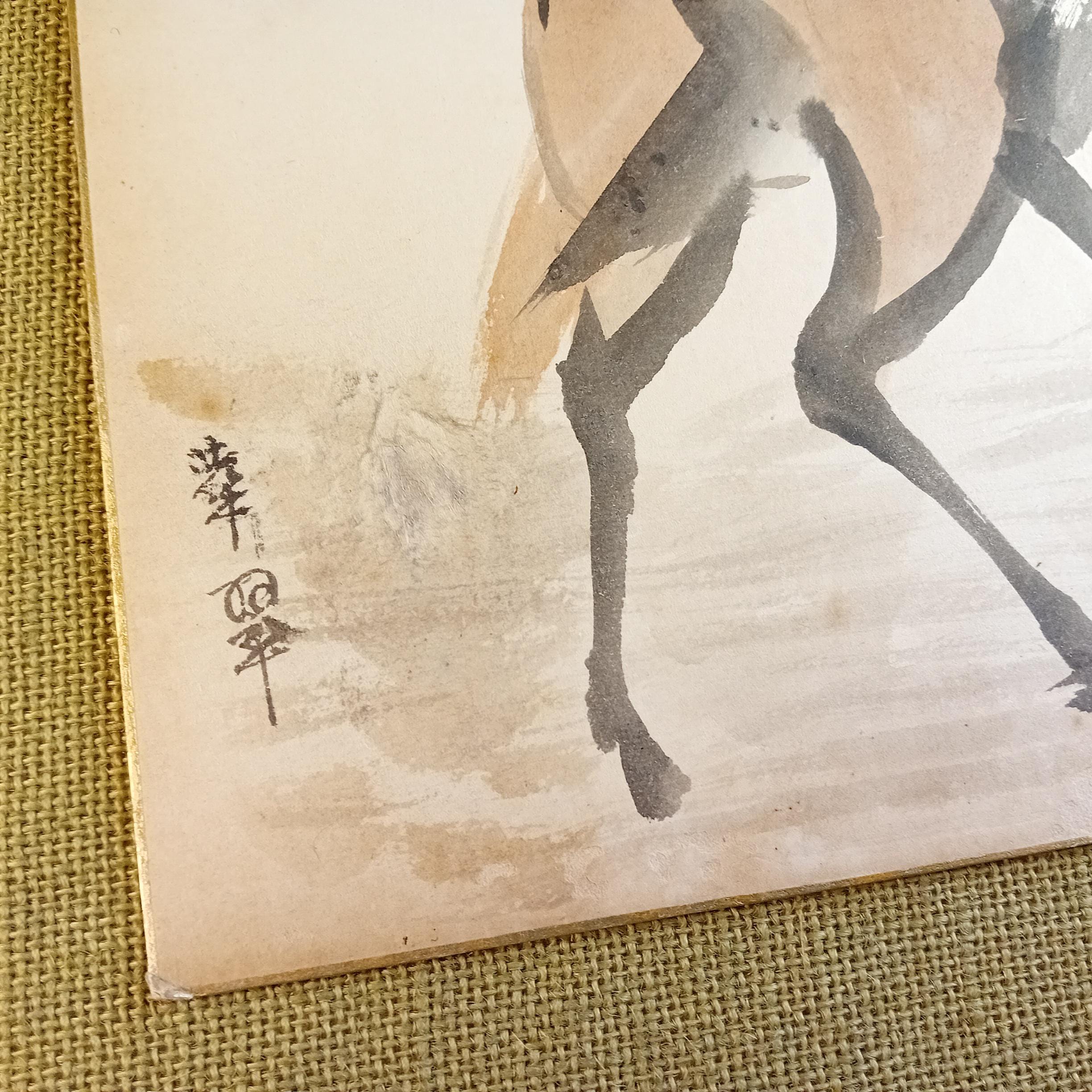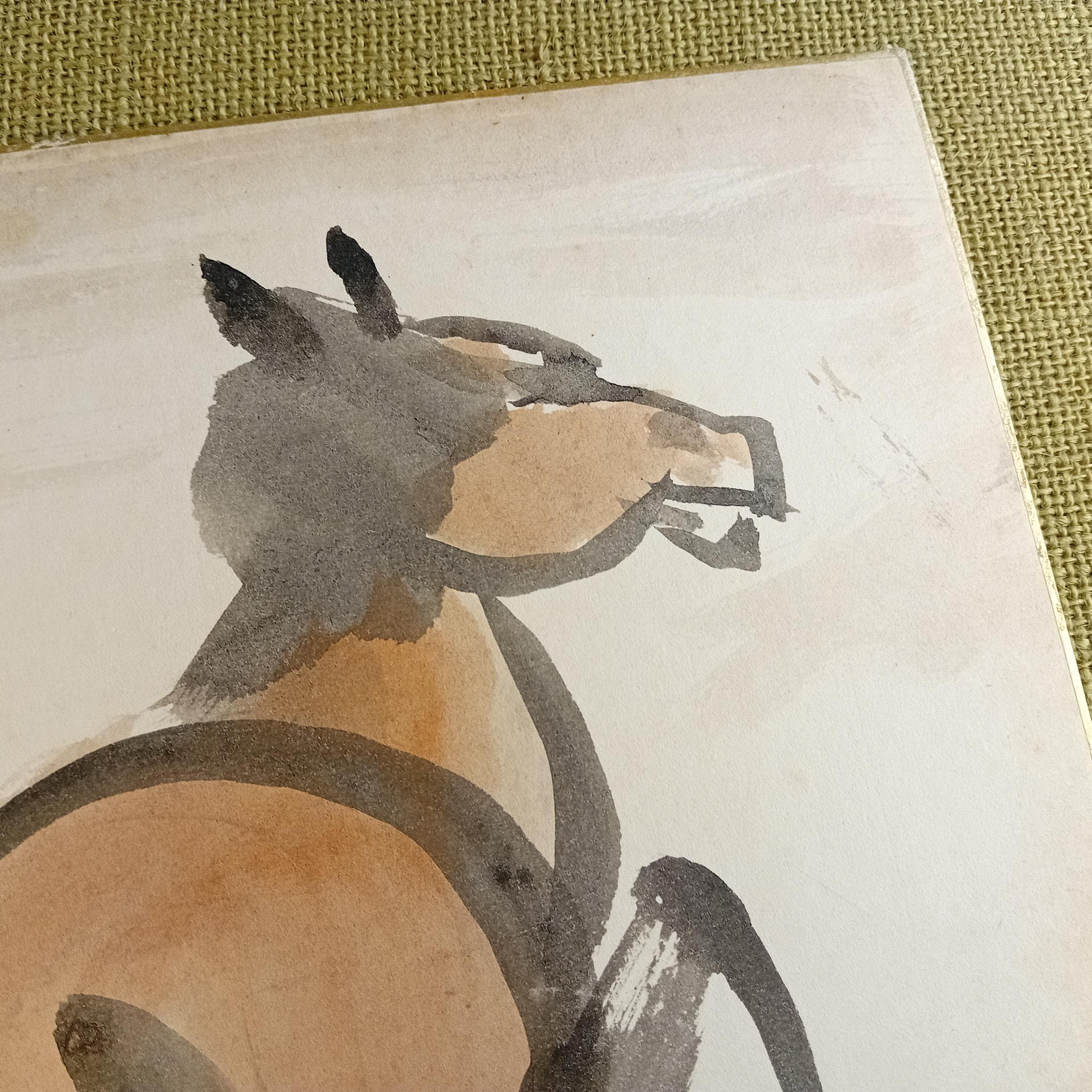 Japanese shikishi from the mid Showa period with a horse image. The work is executed in sumi ink and light color, in a free decorative manner linked to the tradition of Japanese ink painting and calligraphic brush drawing.