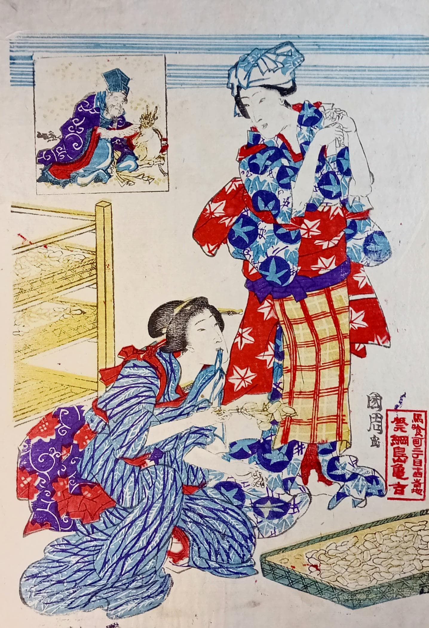 Subject: women with silkworms and cocoons, sericulture scene.