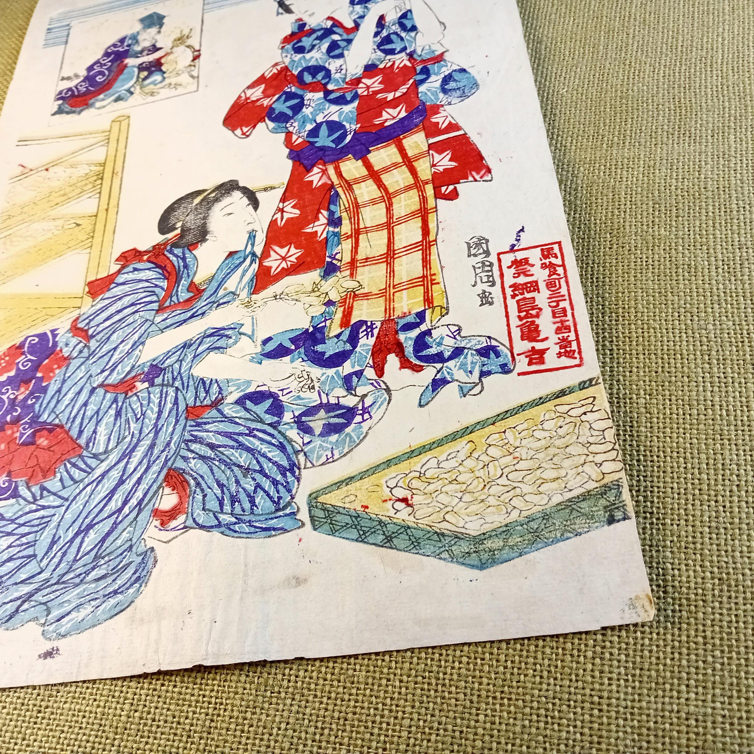 This work is recorded in the Sericultural Nishikie Collection of the Tokyo University of Agriculture and Technology as an untitled sericulture print by Kunichika, published by Tsunashima Kamekichi.